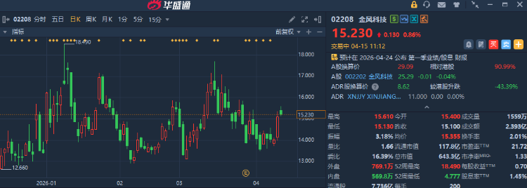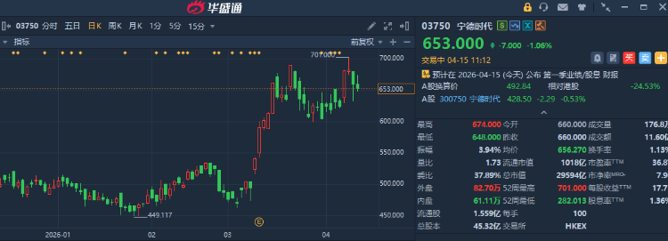 华盛资讯4月15日讯,近期港股新能源产业链整体表现强劲!储能及锂电方面,比亚迪股份、中创新航、赣锋锂业等不断创阶段新高,其中,宁德时代港股更是于近期创下701港元的历史新高,尽管于今日有所调整,但开年来累计升幅仍近37%。此外,风电细分领域同样牛股频出,金风科技、东方电气等开年以来表现强劲。