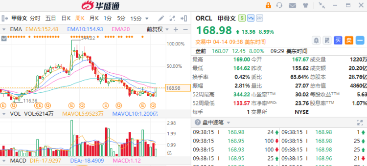 华盛资讯4月14日讯,美股早盘高开高走,纳指涨幅扩大至近1%,甲骨文大涨8%,Bloom Energy暴涨13%,双方宣布达成燃料电池协议。