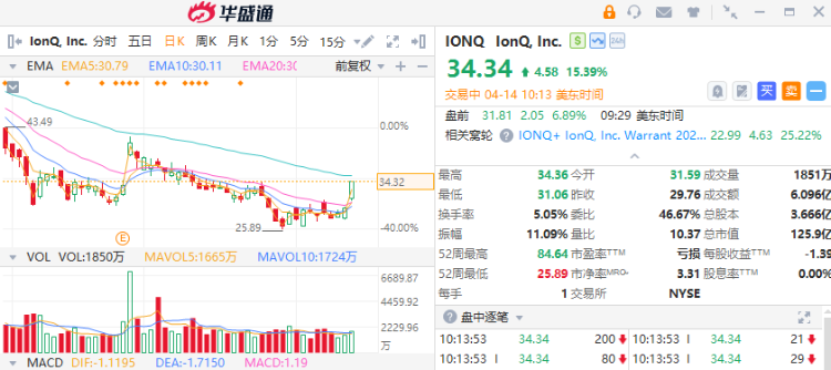 英伟达今日推出开源量子人工智能模型“ISING”,量子计算概念IonQ $IONQ 涨超15%, $RGTI 、 $QBTS 涨超10%。