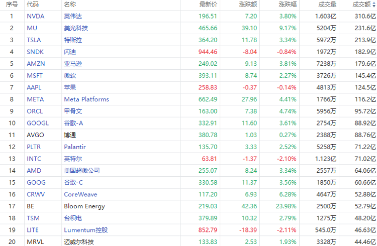 第2名美光收高9.17%,成交229.77亿美元。昨日有报道称,美光科技被列入Seeking Alpha的“杠铃”策略股票名单,该策略融合成长与收益,以应对美伊局势带来的地缘政治和利率不确定性。