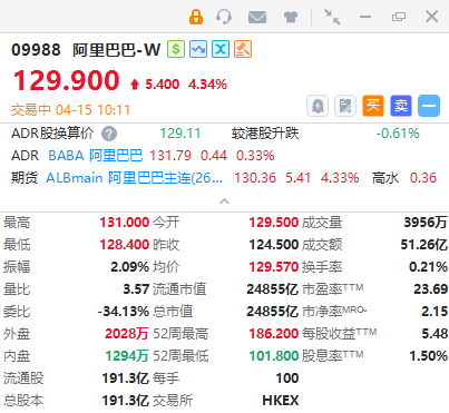华盛资讯4月15日讯,港股阿里巴巴-W盘中涨幅扩大至近4.5%,成交额51亿港元。