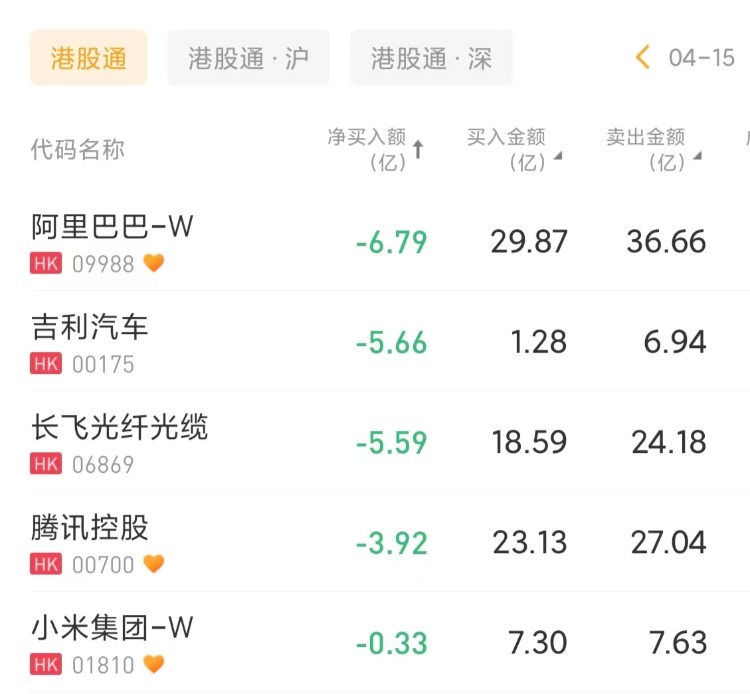 阿里巴巴-W、吉利汽车、长飞光纤光缆分别遭净卖出6.79亿港元、5.66亿港元、5.59亿港元。