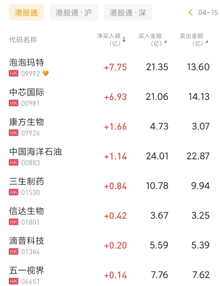 泡泡玛特、中芯国际、康方生物分别获净买入7.75亿港元、6.93亿港元、1.66亿港元;