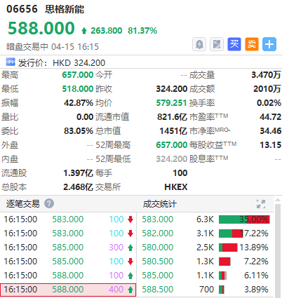 华盛资讯4月15日讯,港股“分布式储能龙头”思格新能正在暗盘交易中。截至发稿,大涨超81%,中签一手账面浮盈26380港元,最新总市值超1451亿港元。