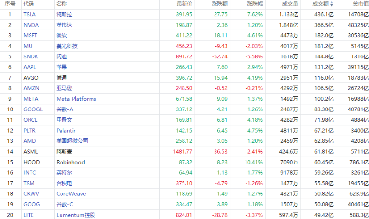 周三美股成交额第1名特斯拉收高7.64%,成交435.13亿美元。特斯拉成为周三市场焦点,此前该公司首席执行官埃隆·马斯克在X平台上发帖称,公司的AI芯片设计团队已完成AI5自动驾驶芯片的研发工作,这一进展使特斯拉向量产迈进一步。