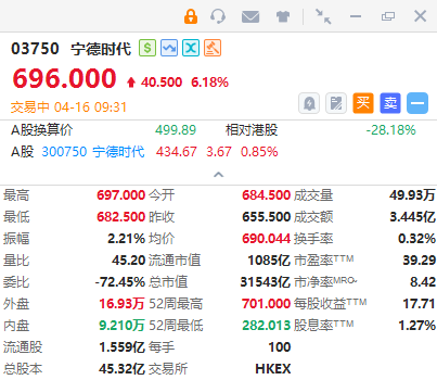 宁德时代(03750)高开逾6%,截至发稿,涨6.18%,报696港元,成交额3.445亿港元。