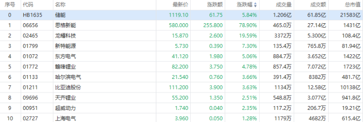 受益市场多重利好,港股储能概念股多数走强。截至发稿,思格新能涨近80%,龙蟠科技涨超19%,宁德时代涨超7%。