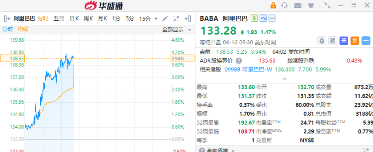 中概股集体大涨,阿里巴巴、百度盘前涨超4%,哔哩哔哩、拼多多涨超1%。