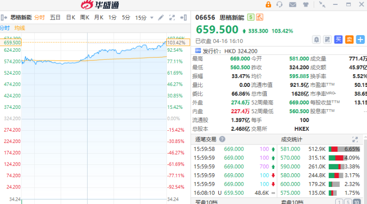 思格新能(6656.HK)今日上市大涨103.42%。若一开盘便卖出,按开盘价581港元计算(不计手续费),中签1手可赚25,680港元;若持有到收盘,按照收盘价659.5港元计算(不计手续费),中签1手可赚33,530港元。