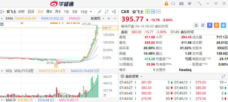 汽车租赁公司安飞士的股价在短短两周内增长至三倍,重创了做空该股的投资者。然而空头并未退缩,反而进一步加码押注——根据S3 Partners数据,该公司股票空头头寸占自由流通股比例已达58%,创近十年新高。