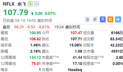 华盛资讯4月17日讯,奈飞盘后重挫近9%!2026财年Q1营收122.50亿美元,同比增长16.2%,归母净利润52.83亿美元,同比增长82.8%。