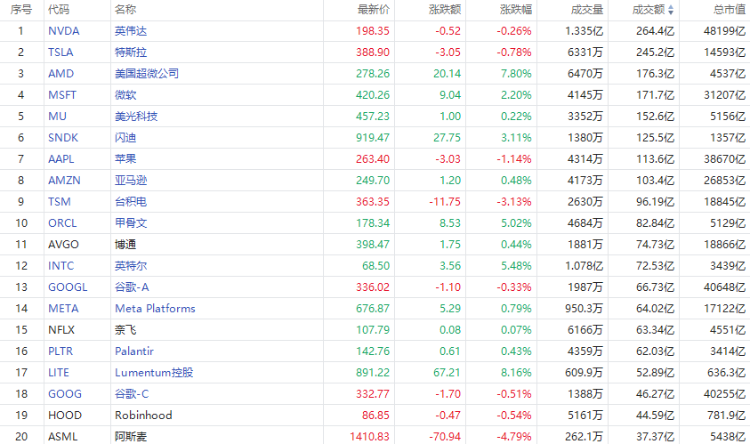 第6名闪迪收高3.11%,成交124.78亿美元。闪迪结束了此前连续两个交易日的下跌行情。
