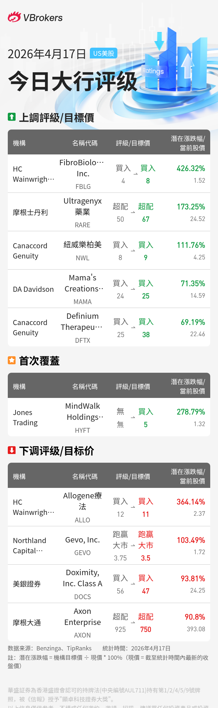 编者按:每日追踪华尔街最新评级与目标价,挖掘潜力股投资机会。