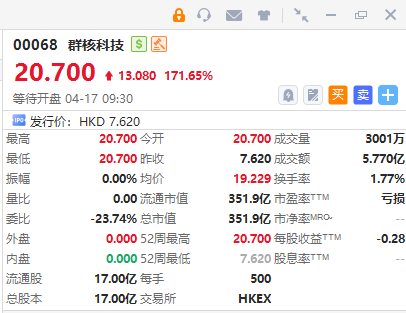 华盛资讯04月17日讯,港股群核科技今日挂牌,截至发稿涨171.65%,报20.70港元/股,中签一手账面浮盈6540.0港元,最新总市值超351.92亿港元。该股此前公开发售获1590.56倍认购,一手中签率3.0%。
