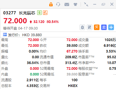 港股长光辰芯今日挂牌,截至发稿涨80.54%,报72.00港元/股,中签一手账面浮盈3212.0港元,最新总市值超313.41亿港元。该股此前公开发售一手中签率1%。