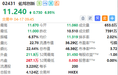佑驾创新涨近7%,报11.24港元,成交额7391万港元。