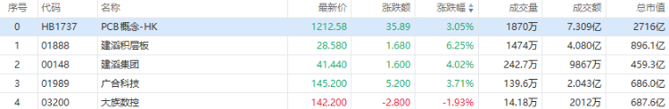 港股PCB概念多数走高,建滔积层板涨超6%再创新高,建滔集团涨超4%,广合科技涨超3%。