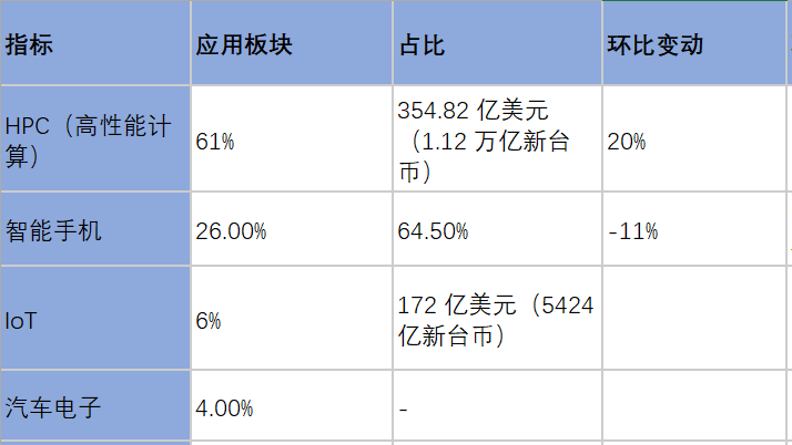 HPC(高性能计算)平台营收占比首次突破60%,达到61%,环比增长20%。智能手机环比下降11%至26%,IoT占6%,汽车电子仅占4%。