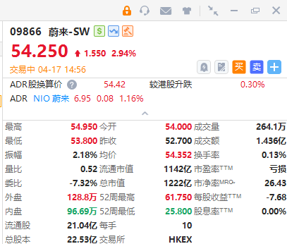 智通财经APP获悉,蔚来-SW(09866)逆势涨近3%,截至发稿,涨2.94%,报54.25港元,成交额1.436亿港元。