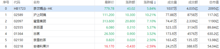 今日港股茶饮股表现亮眼。截至发稿,沪上阿姨涨超10%,蜜雪集团涨超7%,古茗涨超3%,奈雪的茶涨超2。