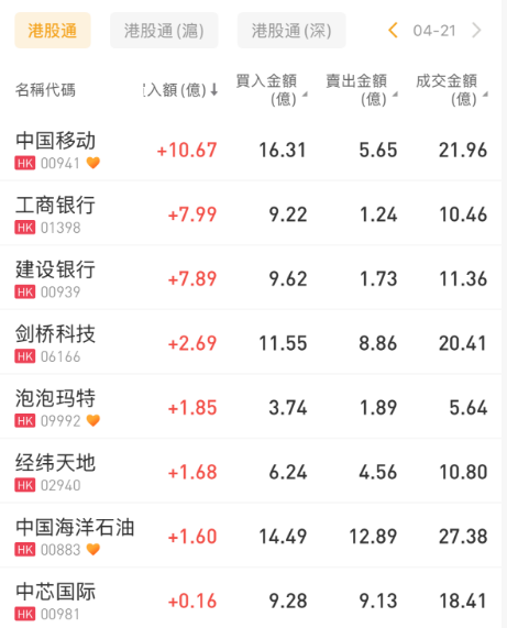 净买入中国移动10.67亿、工商银行7.99亿、建设银行7.89亿港元。
