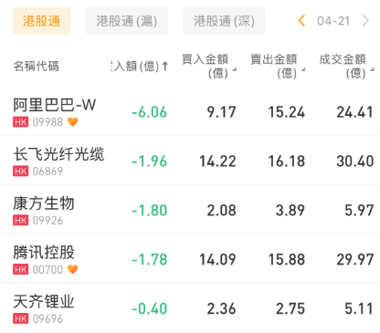 净卖出阿里巴巴-W6.06亿、长飞光纤光缆1.96亿、康方生物1.8亿港元。