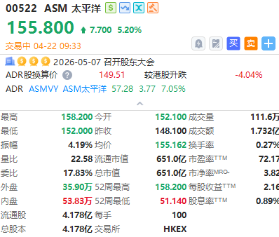 华盛资讯4月22日讯,港股ASM 太平洋盘初涨超5%,该公司此前公布2026年第一季度业绩,持续经营业务销售收入为港币 39.7 亿元(5.08 亿美元),高于销售收入预测的中位数,按季增长 0.2%,按年亦增长 32.0%。