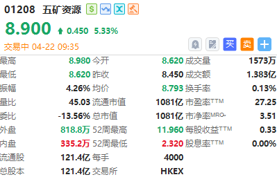 五矿资源涨超5%,2026年第一季度,铜总产量(包括电解铜及铜精矿含铜)为12.87万吨,较2025年同期增长9%。Las Bambas的铜精矿含铜产量达10.1万吨,同比增长6%,主要源于选冶回收率的提升,这一改善得益于Ferrobamba矿坑矿石供应量和矿石品位的提高。