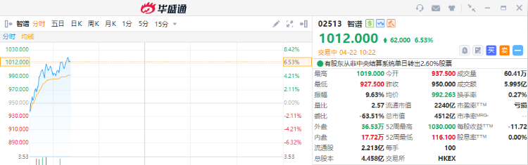 智谱涨超6%,报1012港元,成交额近6亿港元。