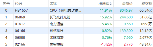 4月22日讯,港股CPO概念再度走强,CPO概念持续走高,剑桥科技直线拉涨近11%,长飞光纤光缆、南方通信涨超15%。