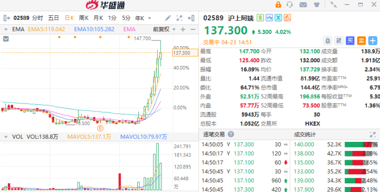 4月23日讯,沪上阿姨最高涨超11%,午后涨势缩窄至4%,公司连续六个交易日大涨,连续本月累计涨幅超80%。