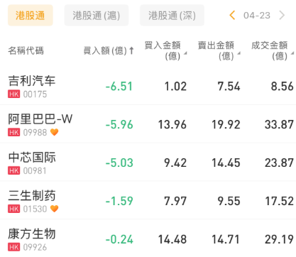 净卖出吉利汽车6.51亿、阿里巴巴-W5.96亿、中芯国际5.03亿港元。