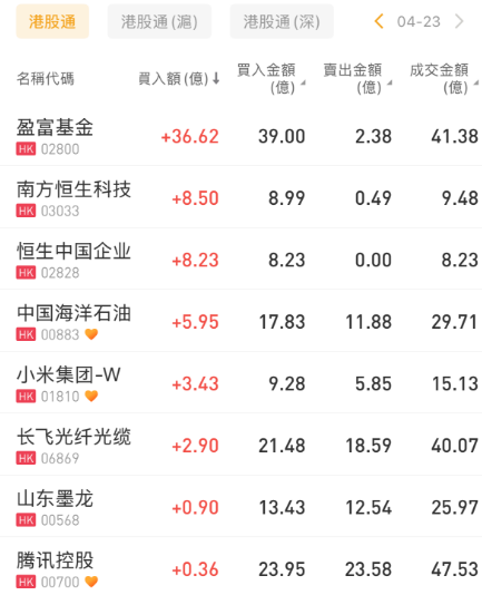净买入盈富基金36.6亿、中国海洋石油5.95亿、小米集团-W3.41亿港元。