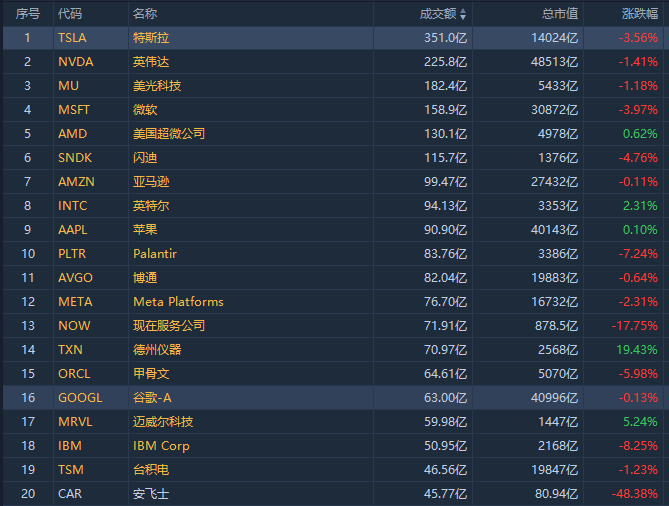 第14名德州仪器收高19.43%,成交70.93亿美元。德州仪器2026年第一季度营收、利润及二季度指引均超出市场预期,AI相关业务增长强劲,传统业务复苏支撑股价走高。