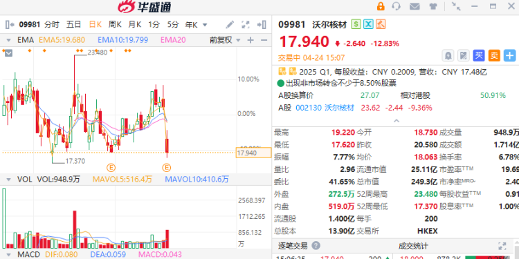 4月24日讯,沃尔核材今日大跌近13%,公司发布公告,于2026年第一季度,营业收入约20.32亿元,同比增长15.52%;归属于上市公司股东的净利润约2.31亿元,同比减少7.63%;基本每股收益0.1726元。