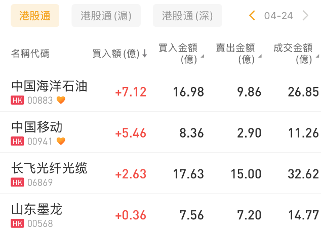 净买入中国海洋石油7.12亿、中国移动5.46亿、长飞光纤光缆2.63亿港元。
