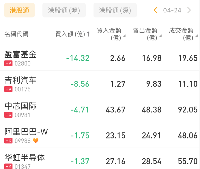 净卖出盈富基金14.32亿港元、吉利汽车8.56亿、中芯国际4.71亿港元。