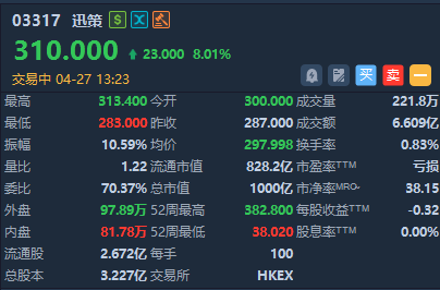 迅策快速拉升,现涨超8%,成交额超6.6亿港元。