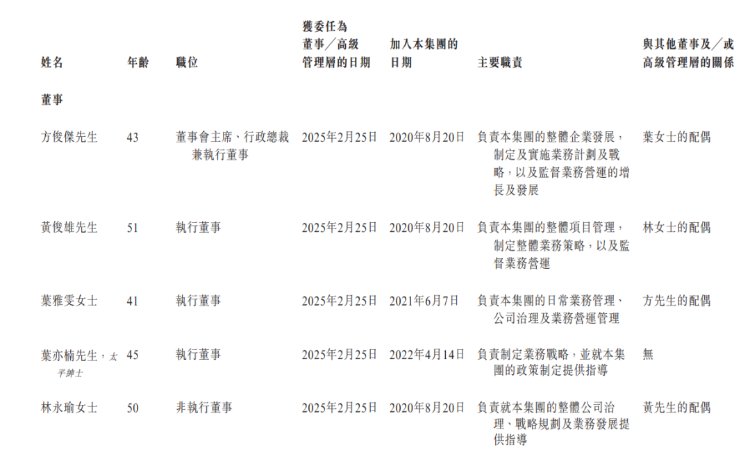 公司董事會由八名董事組成,包括四名執行董事,一名非執行董事及三名獨立非執行董事。方俊傑為董事會主席、執行董事兼行政總裁,主要負責整體企業發展,制定及實施業務計劃及戰略,以及監督業務營運的增長及發展。