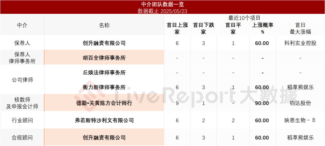 據LiveReport大數據統計,安聯國際中介團隊共計5家,其中保薦人1家,近10家保薦項目數據表現欠佳;公司律師共計1家,綜合項目數據較好。整體而言中介團隊歷史數據表現一般。