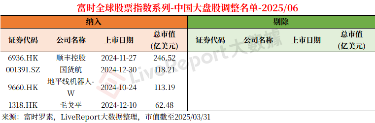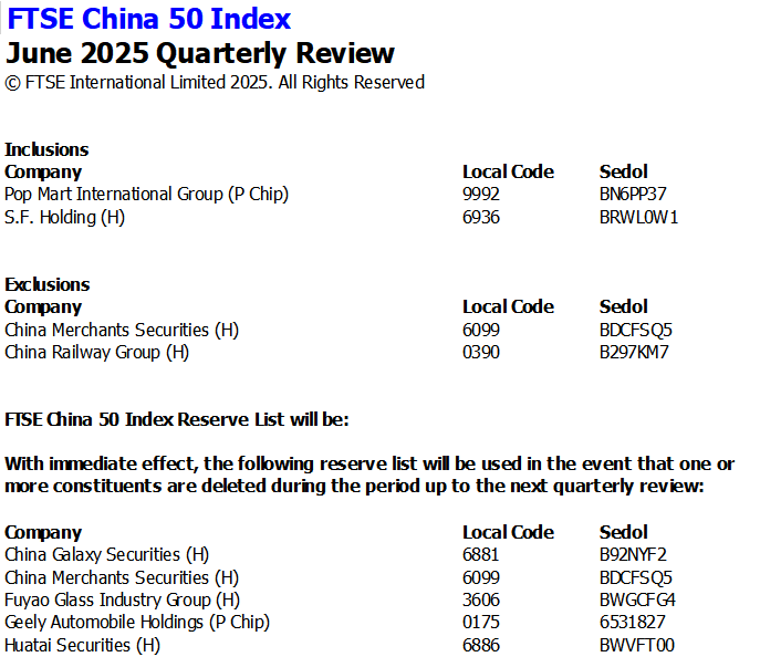 此次调整为富时全球股票指数系列季度调整,成份股变动