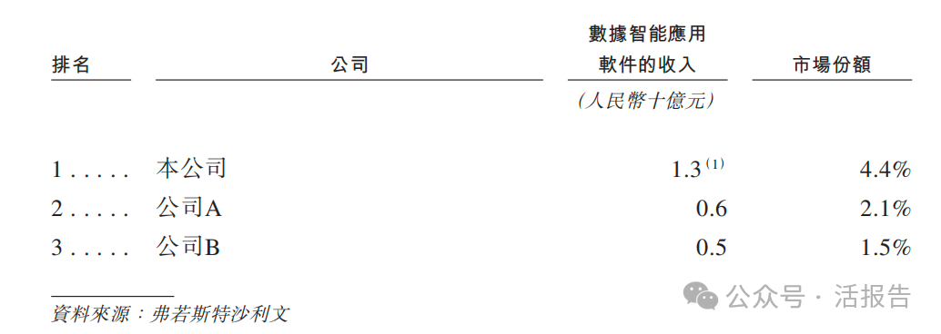 根據弗若斯特沙利文資料,按2023年收入計,公司是中國最大的數據智能應用軟件供應商,按2023年數據智能收入計的中國三大數據智能應用軟件供應商。