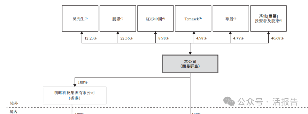 吳先生持股12.25%、騰訊持股22.36%、紅杉中國持股8.98%、淡馬錫持股4.98%、華晟持股4.77%、其他股東持股46.68%。