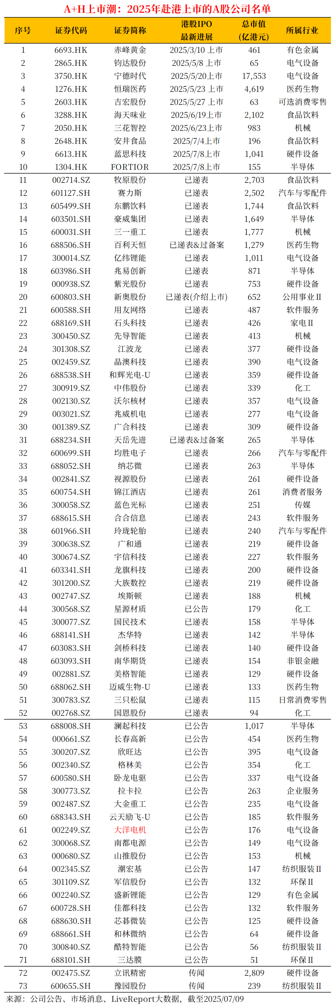 据LiveReport大数据统计,截至7月9日,今年已有赤峰黄金(6693.HK)、钧达股份(2865.HK)、宁德时代(3750.HK)、恒瑞医药(1276.HK)、吉宏股份(2603.HK)、海天味业(3288.HK)、三花智控(2050.HK)、安井食品(2648.HK)、蓝思科技(6613.HK)及FORTIOR(1304.HK)登陆港交所,实现AH上市;此外,还有63家公司拟“A+H”上市,其中42家已递表,19家已发公告,2家传闻上市,AH上市浪潮势不可挡。