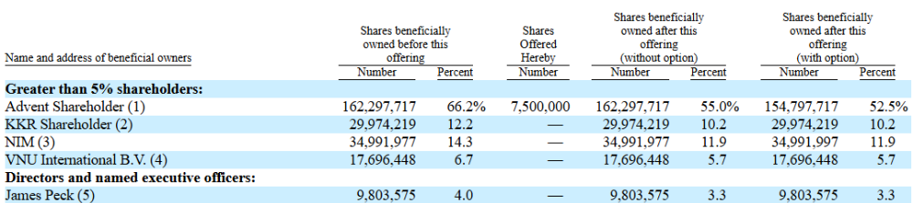 公司IPO前的主要股东包括:安宏资本Advent(66.2%),KKR(12.2%),NIM(14.3%),VNU International B.V.(6.7%),公司CEO兼董事会主席James Peck(4.0%)。
