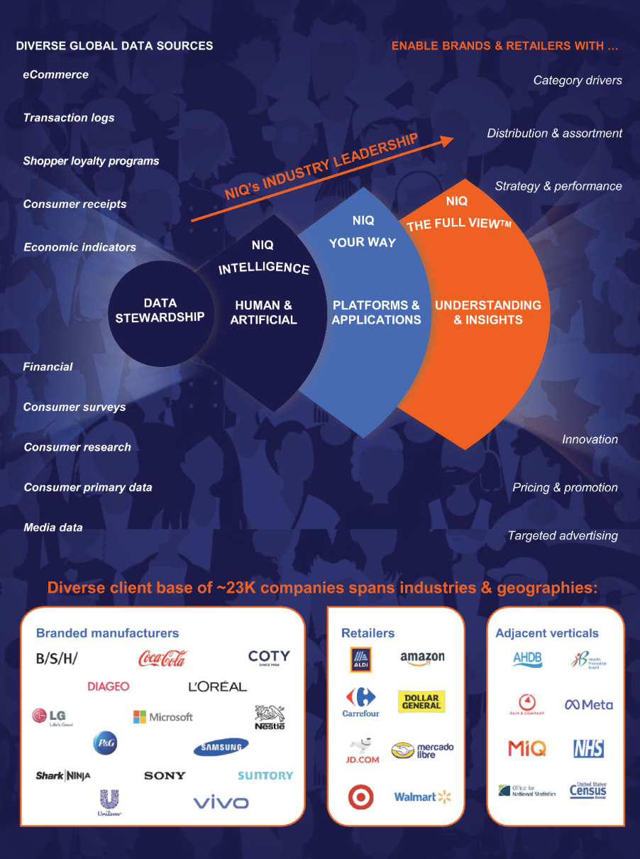 截至2024年12月31日,NielsenIQ的业务覆盖全球90多个国家,涵盖约85%的世界人口、超半数全球GDP,以及超过7.2万亿美元的全球消费者支出。客户包括但不限于可口可乐、雀巢、三星和索尼等知名品牌和沃尔玛、亚马逊、京东等零售商。