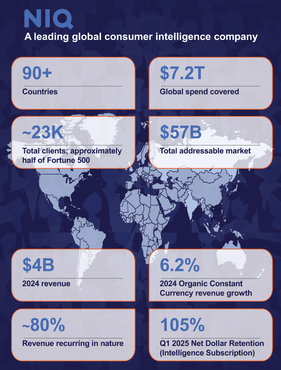 2025年7月15日,全球领先的消费品及服务市场研究机构NIQ Global Intelligence(NielsenIQ)公布了其美股IPO条款,计划发行5000万股普通股,发行价区间为20至24美元,预计募资11亿美元。