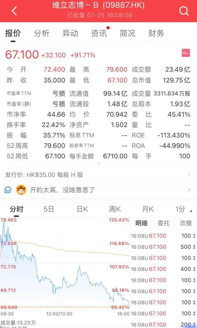 上市首日,维立志博直接高开106.9%,随即股价快速拉升至79.6港元,涨幅127.4%,上午10:00后大量小单抛售,股价高位回落,涨幅收窄,最终收涨91.71%,报67.1港元/股,首日成交额高达23.49亿港元,最新总市值129.75亿港元。按首日开盘价计,一手收益3740港元。
