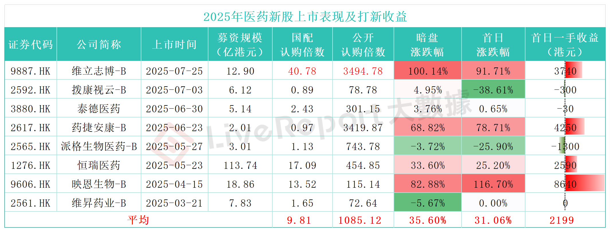 从暗盘及首日表现来看,今年上市的医药新股暗盘股价平均涨幅35.60%,6只新股均在暗盘录得正涨幅,其中维立志博-W暗盘股价翻倍,表现最亮眼;首日股价平均涨幅31.06%,映恩生物-W首日股价翻倍,维立志博、药捷安康、恒瑞医药均实行双位数涨幅。