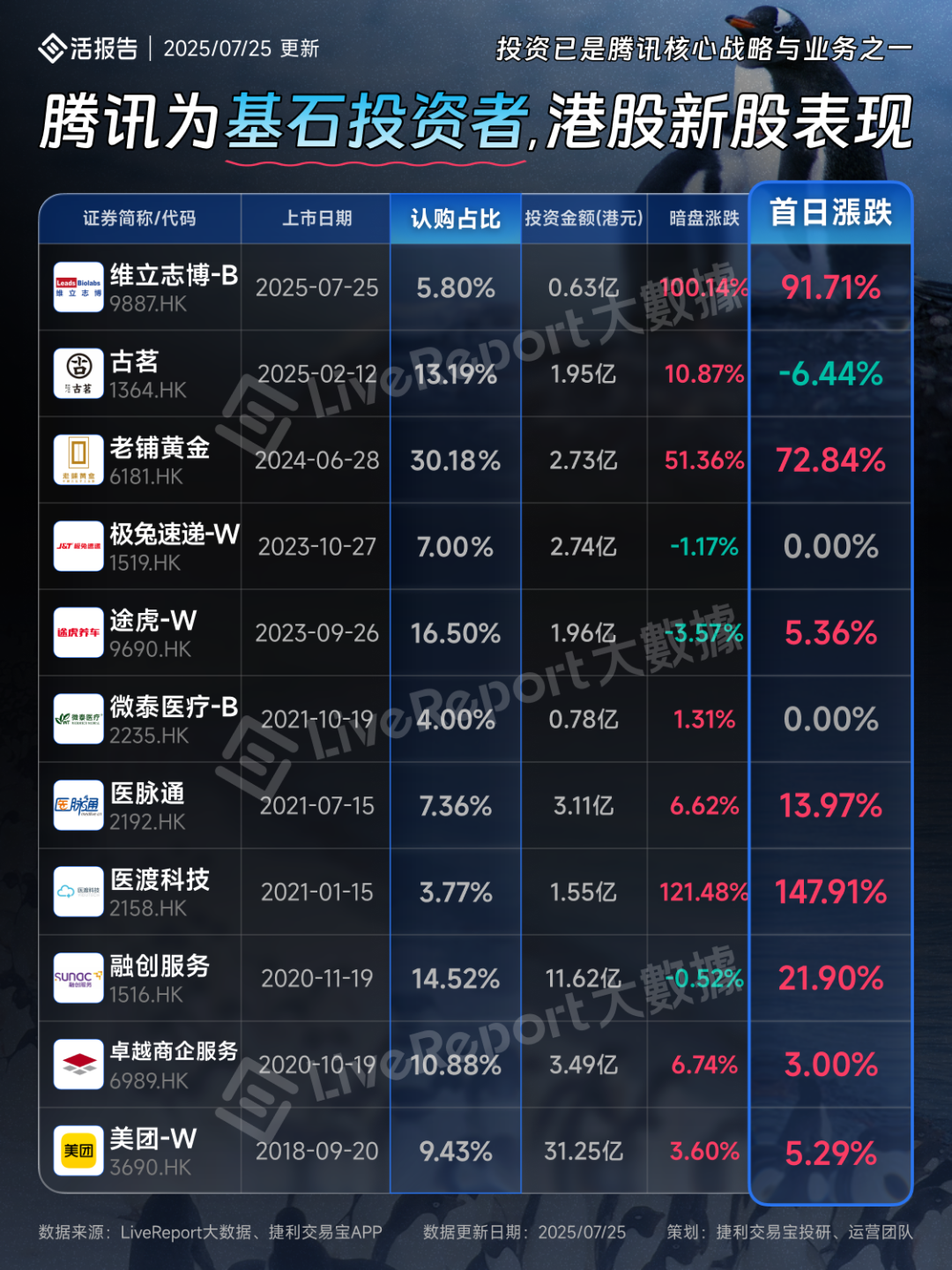 据LiveReport大数据统计,历史上腾讯作为基石投资者的港股新股首日表现大多非常亮眼。